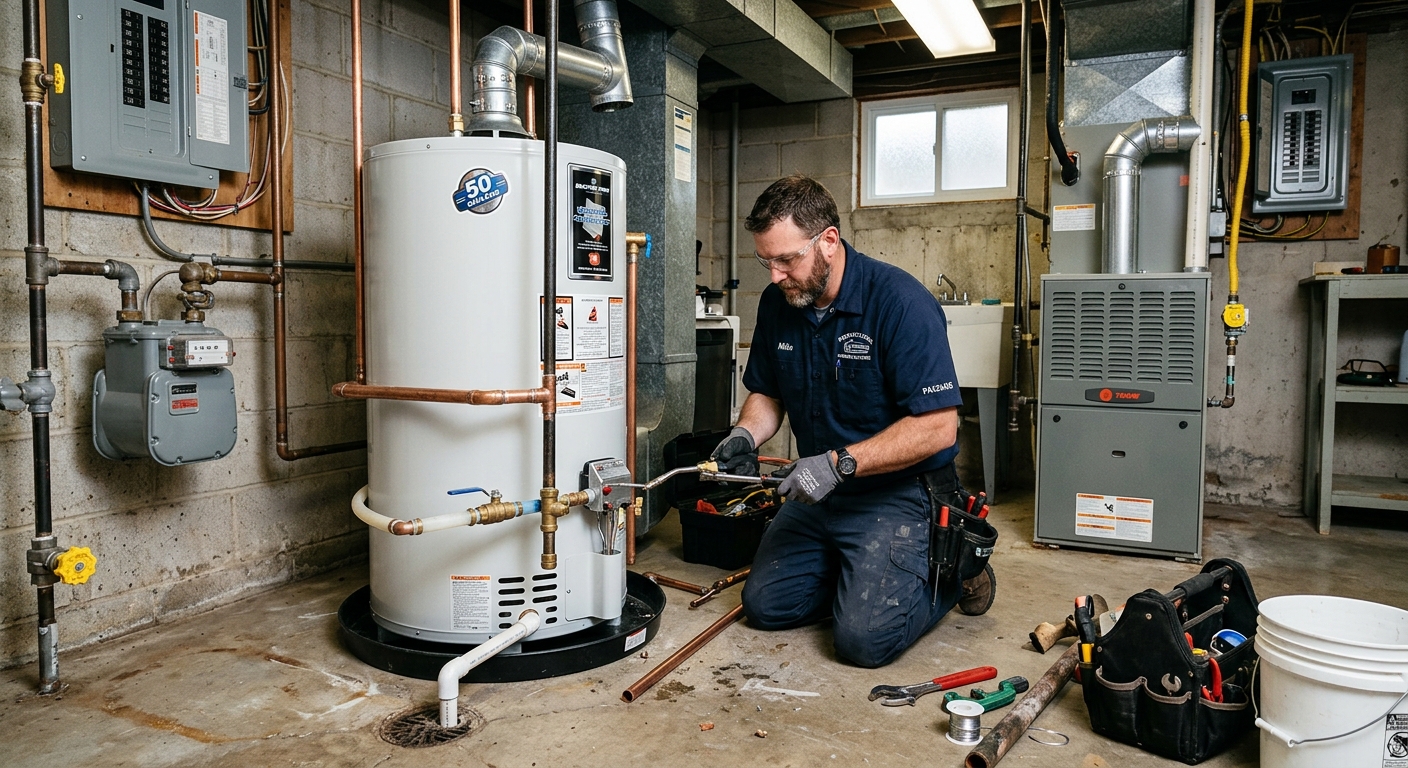 Tank and tankless water heater replacement by licensed Summit plumbers. We remove the old unit, install the new heater, connect gas or electrical supply, adjust temperature settings and test thoroughly. Most replacements completed in 2-4 hours.