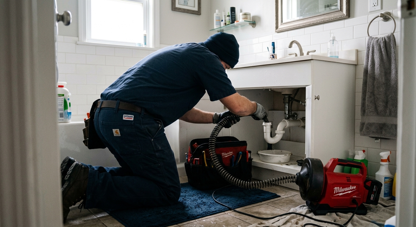 Professional drain cleaning for Unity homes — kitchen drains, bathroom clogs, main sewer line clearing. Motorized snake and hydro-jetting available. Camera inspection to diagnose root intrusion or pipe damage.
